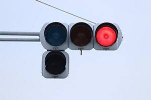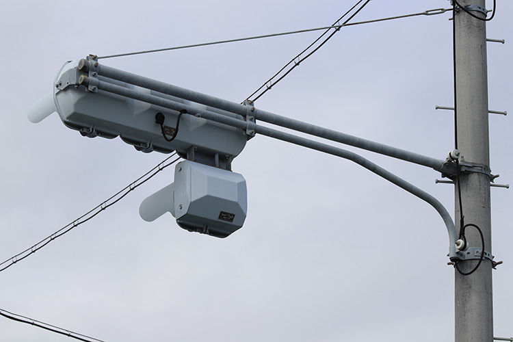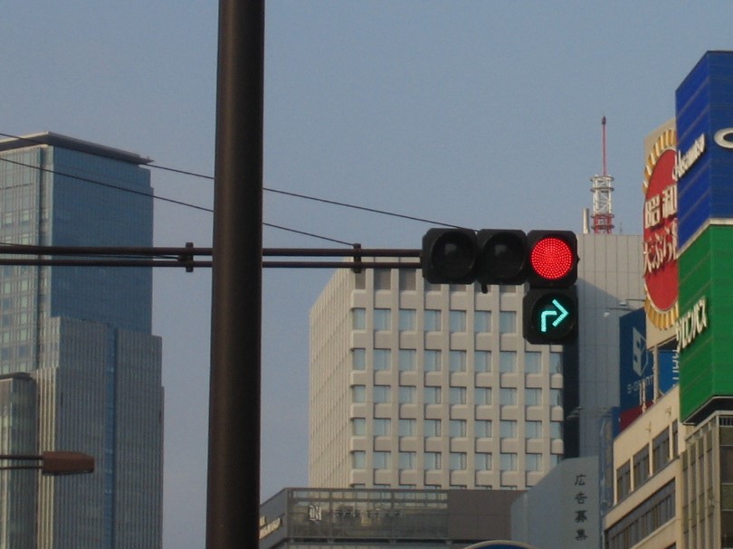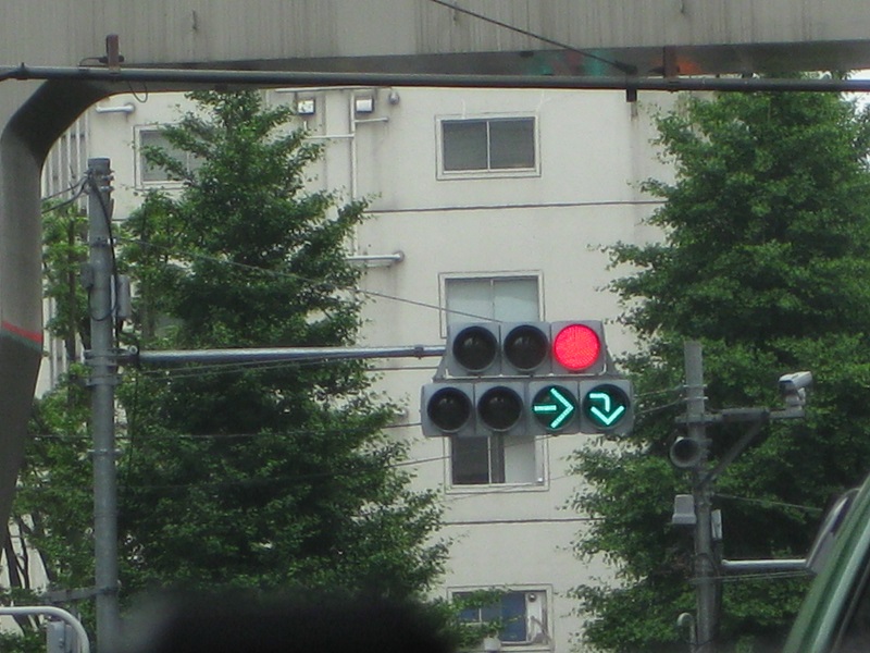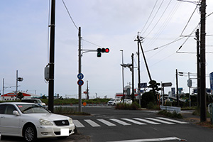 左からの合流がある場所に設置されていました。赤でも先の交差点で右折する車だけは進めるように、曲がった矢印が設置されていました。その後、交差点の形状が変更されて矢印は撤去されました。現在では交差点自体が無くなっています。