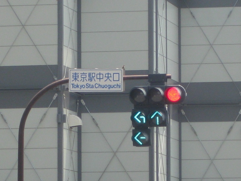 交差点形状が特殊であったため、直進した先で左折するための曲がった矢印が設置されていました。現在は交差点が丁字路に変更され、矢印は撤去されています。また、直進先のロータリーは道路が無くなり、東京駅丸の内駅前広場になっています。