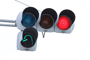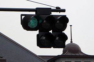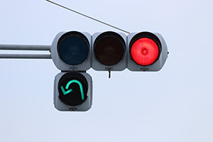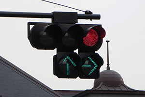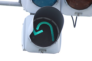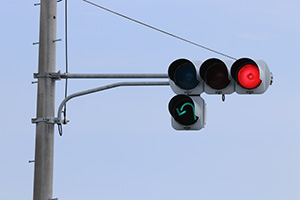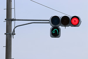 2009年頃までは普通のセパレート信号でしたが、2010年頃に転回用の矢印が設置されました。当時の道路交通法では右折矢印では転回ができなかったため増設したようです。しかし、2012年4月に道路交通法が改正されて右折矢印でも転回ができるようになり、転回矢印は不要になったため、元の矢印に戻されました。
