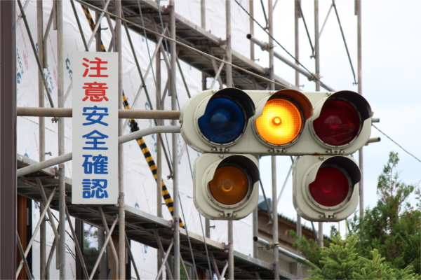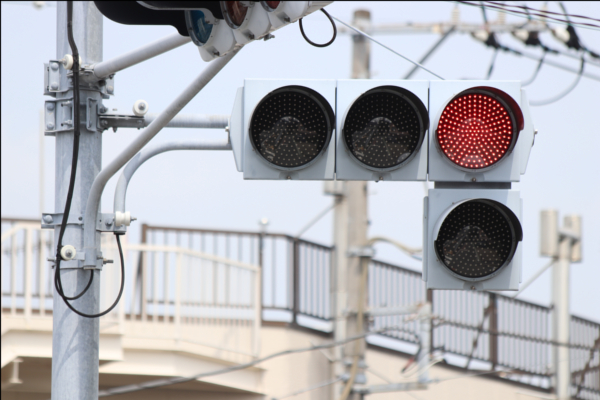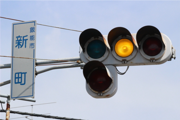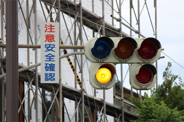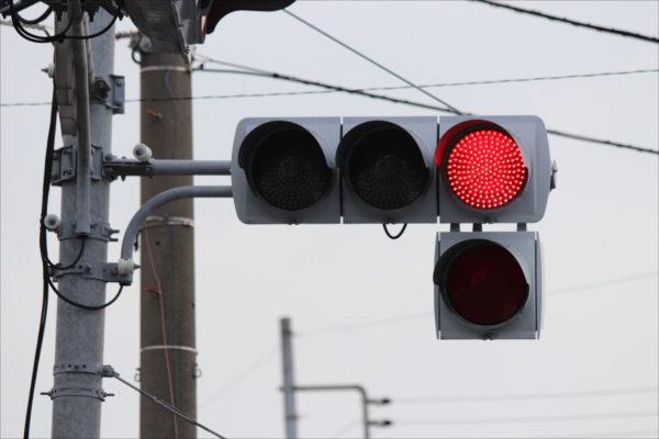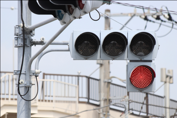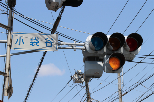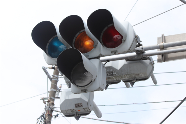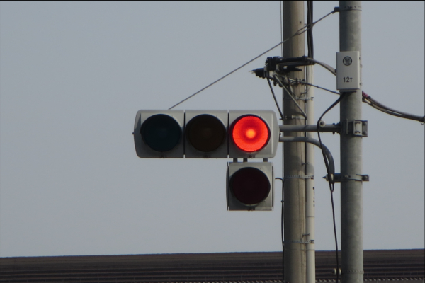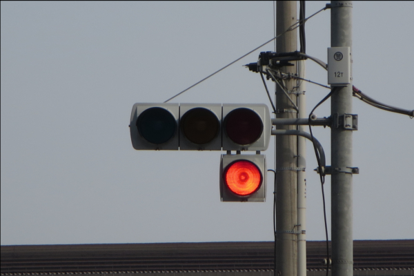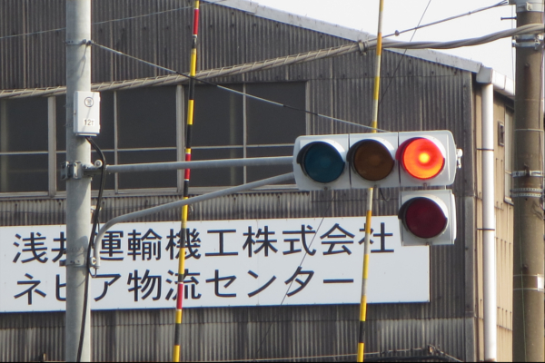 交差点の手前に踏切があるため、青を使わずに黄色点滅と赤点滅で制御しています。点滅制御であることを分かりやすくするために点滅用のおまけの1灯が3色の信号機の下に設置されています。おまけの1灯は通常の電球が使われていますが、本灯器はLED電球です。
