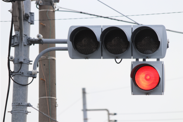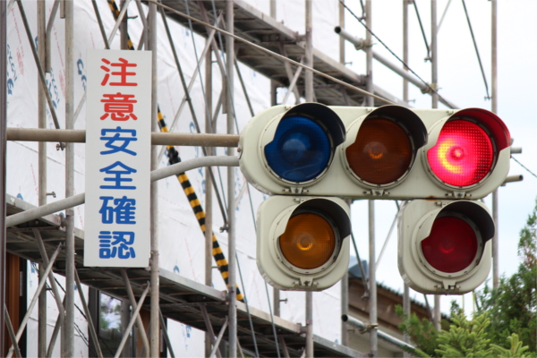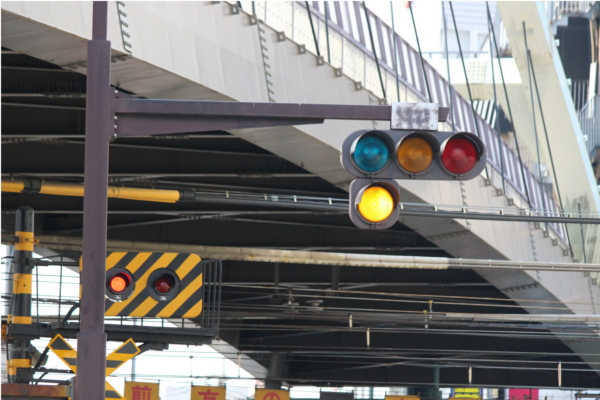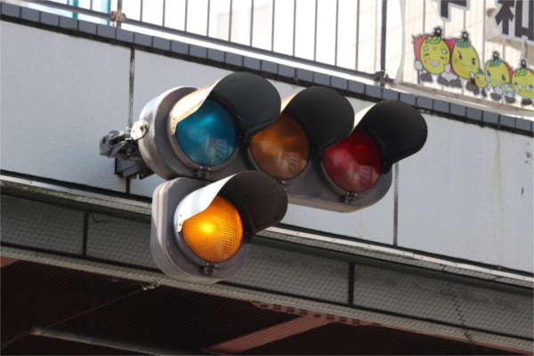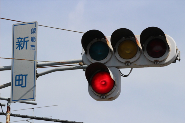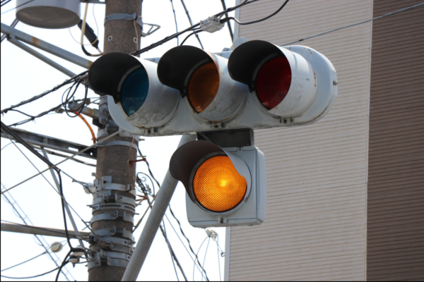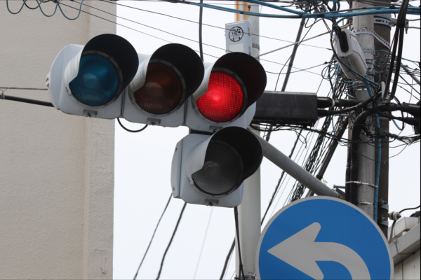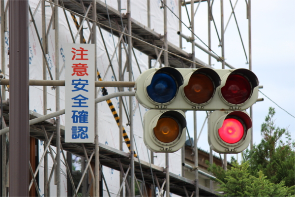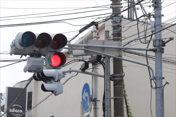交差点に一時停止で進入させるために、青を使わずに赤点滅で制御しています。点滅制御であることを分かりやすくするために点滅用のおまけの1灯が3色の信号機の下に設置されています。下赤点滅→赤→…のサイクルです