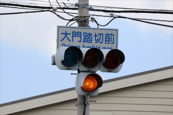 変則的な形の交差点のため、青を使わずに黄色点滅で制御しています。点滅制御であることを分かりやすくするために点滅用のおまけの1灯が3色の信号機の下に設置されています。。下黄点滅→上黄点灯→赤→…のサイクルです 大門踏切前