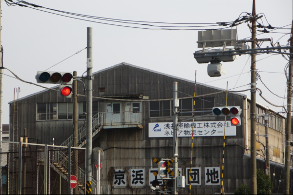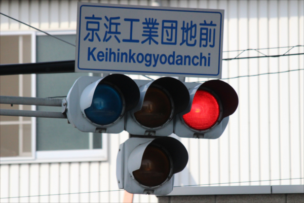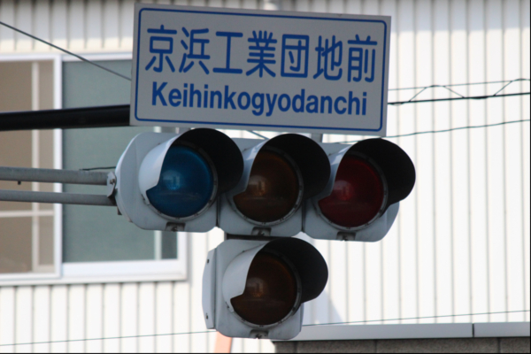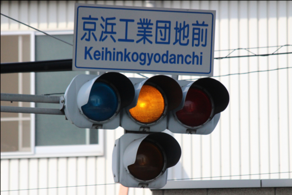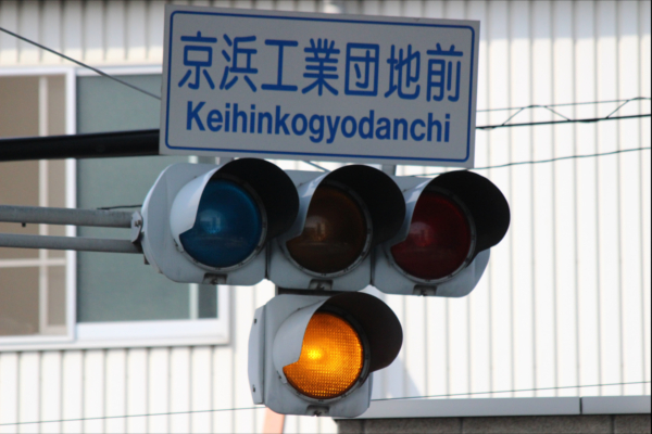 交差点の手前に踏切があるため、青を使わずに黄色点滅で制御しています。点滅制御であることを分かりやすくするために点滅用のおまけの1灯が3色の信号機の下に設置されています。下黄点滅→上黄点灯→赤→…のサイクルです 京浜工業団地前
