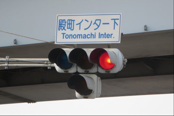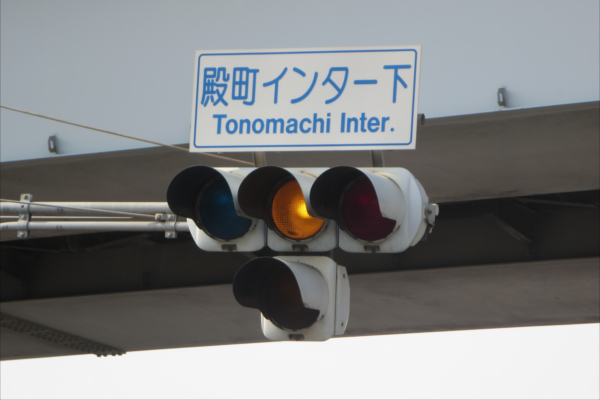 交差点の近くに踏切があるため、青を使わずに黄色点滅と赤点滅で制御しています。点滅制御であることを分かりやすくするために点滅用のおまけの1灯が3色の信号機の下に設置されています。押ボタンが押されると全ての車両用信号が赤になり、歩行者用が青になります。 殿町インター下
