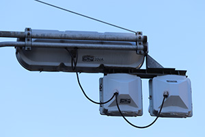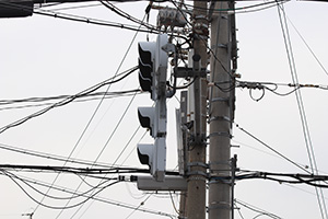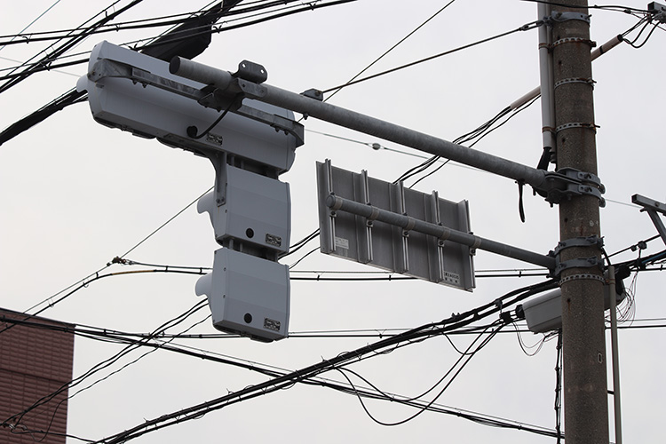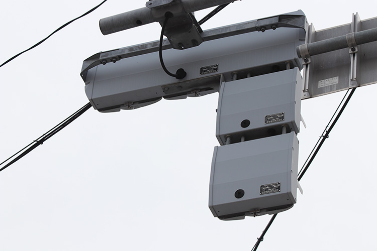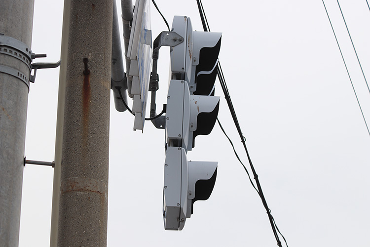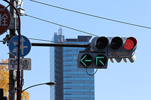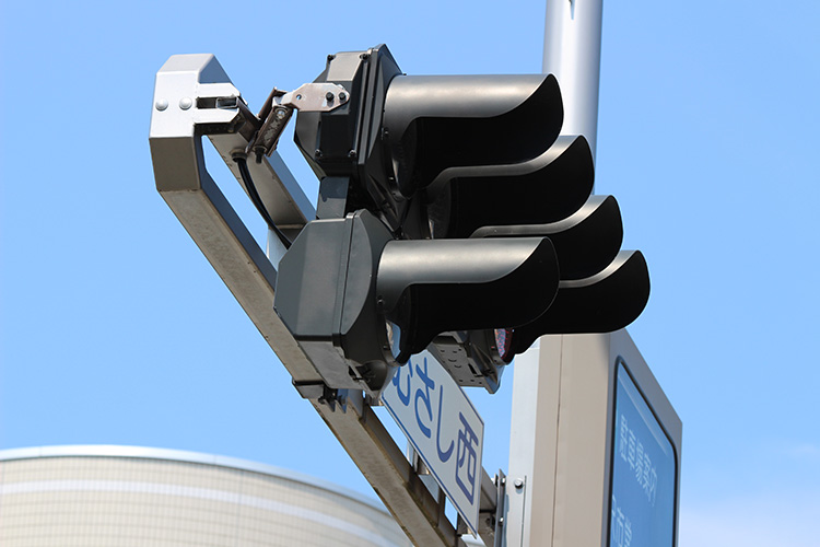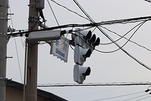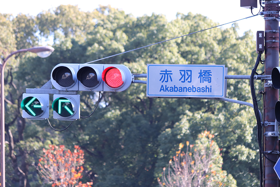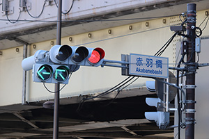左方向に道が2つあり、矢印を普通に設置すると直進と間違えられる可能性があるため、矢印が青の左隣と、その下に設置されています。矢印は朝と夕方の一部時間帯しか点灯しません。(撮影時は矢印の点灯は見られませんでした…)