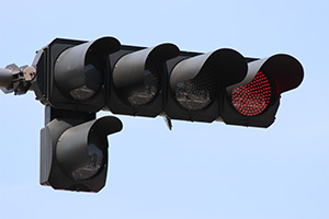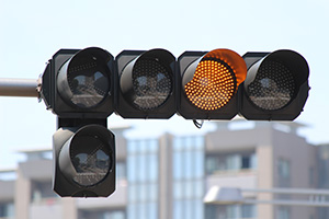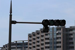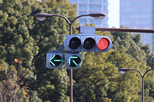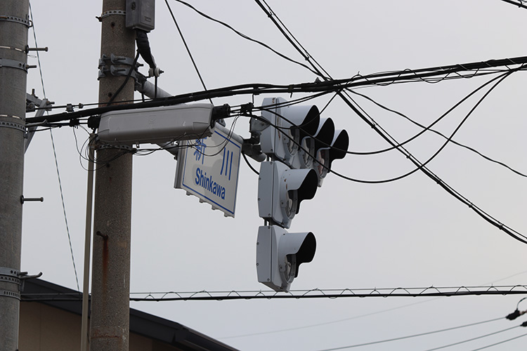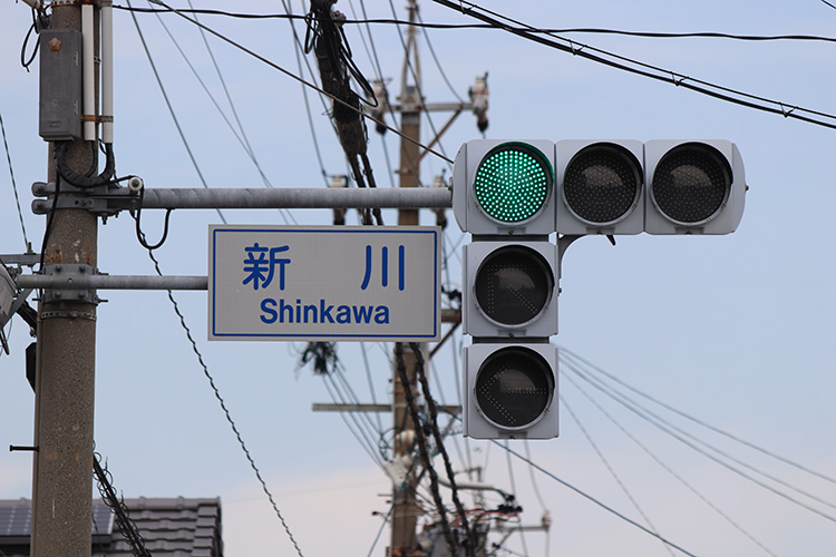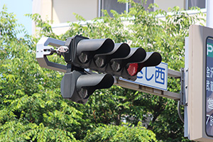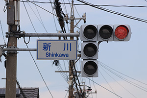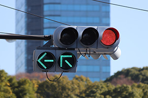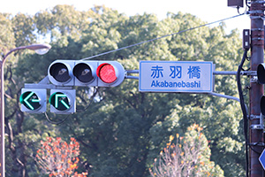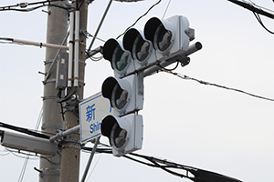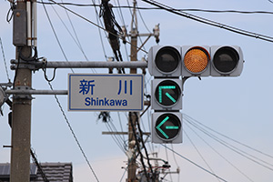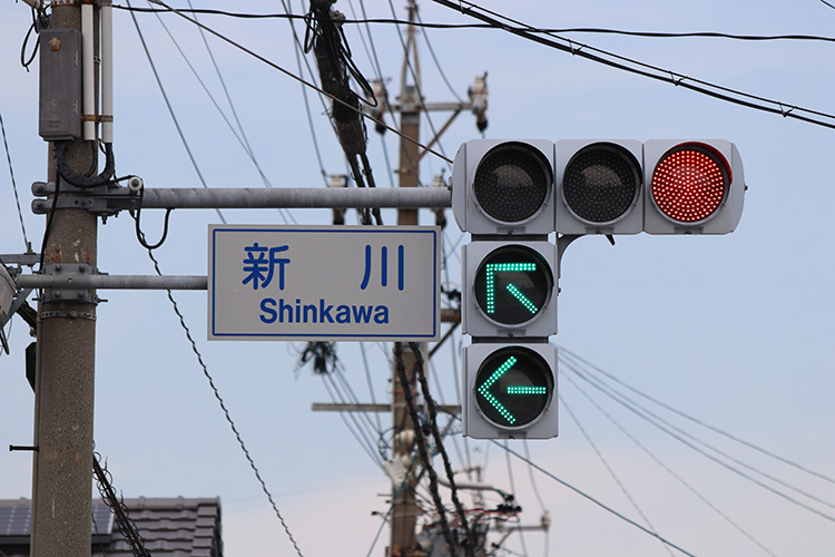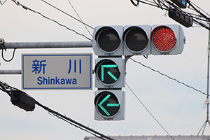 左方向に道が2つあり、矢印を普通に設置すると直進と間違えられる可能性があるため、矢印が青の下に2つ縦並びで設置されています。矢印からは黄色を挟まず赤に変わります。