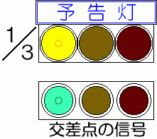長野式のYYR予告灯です。前方の信号機が青の時は下と真ん中の黄色が交互点滅し、黄色の時は真ん中の黄色が点灯し、赤の時は赤が点灯します。
