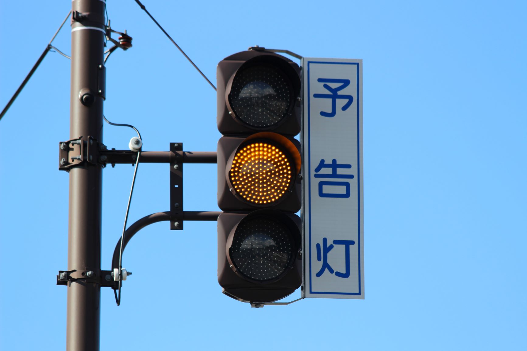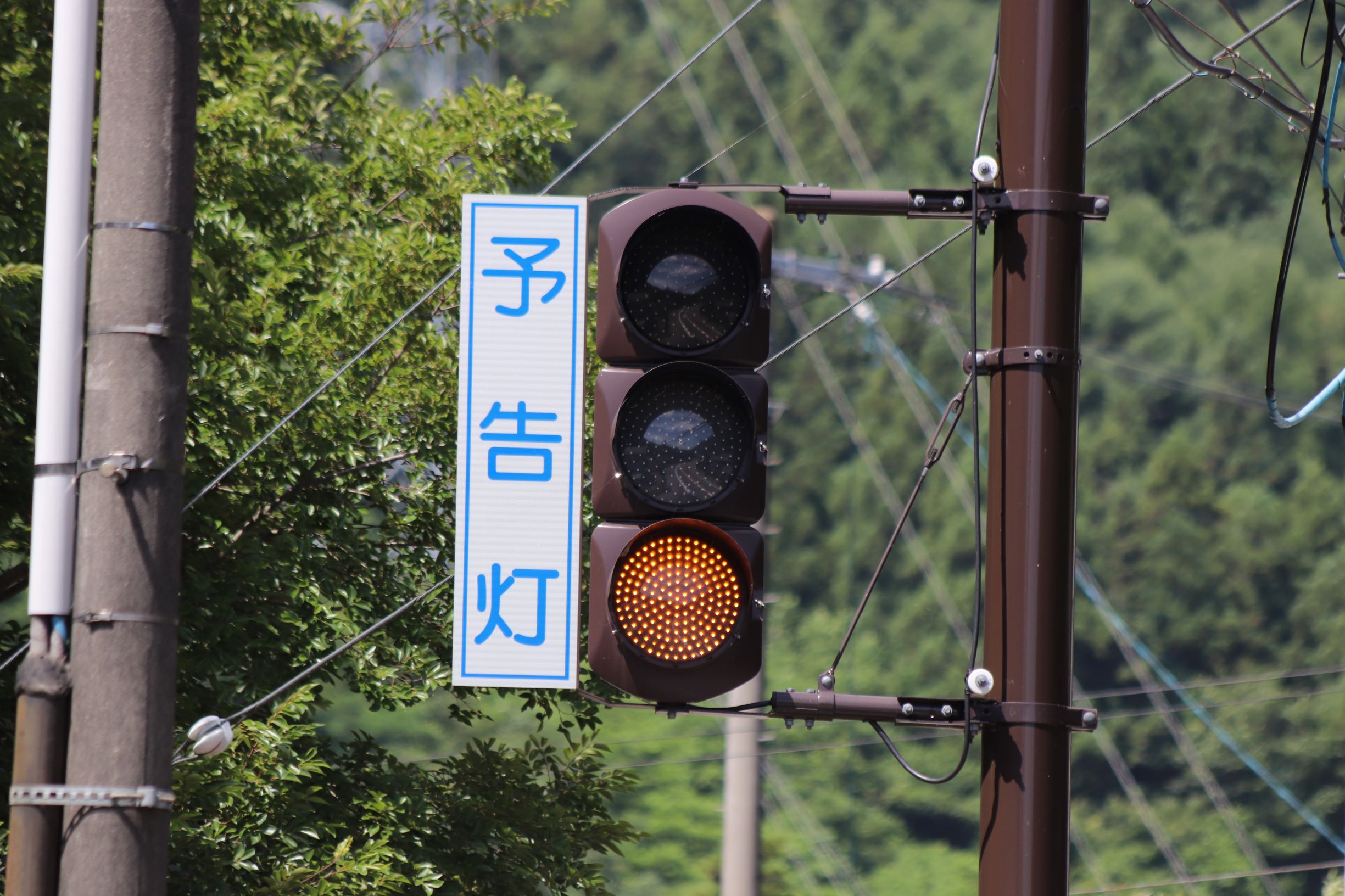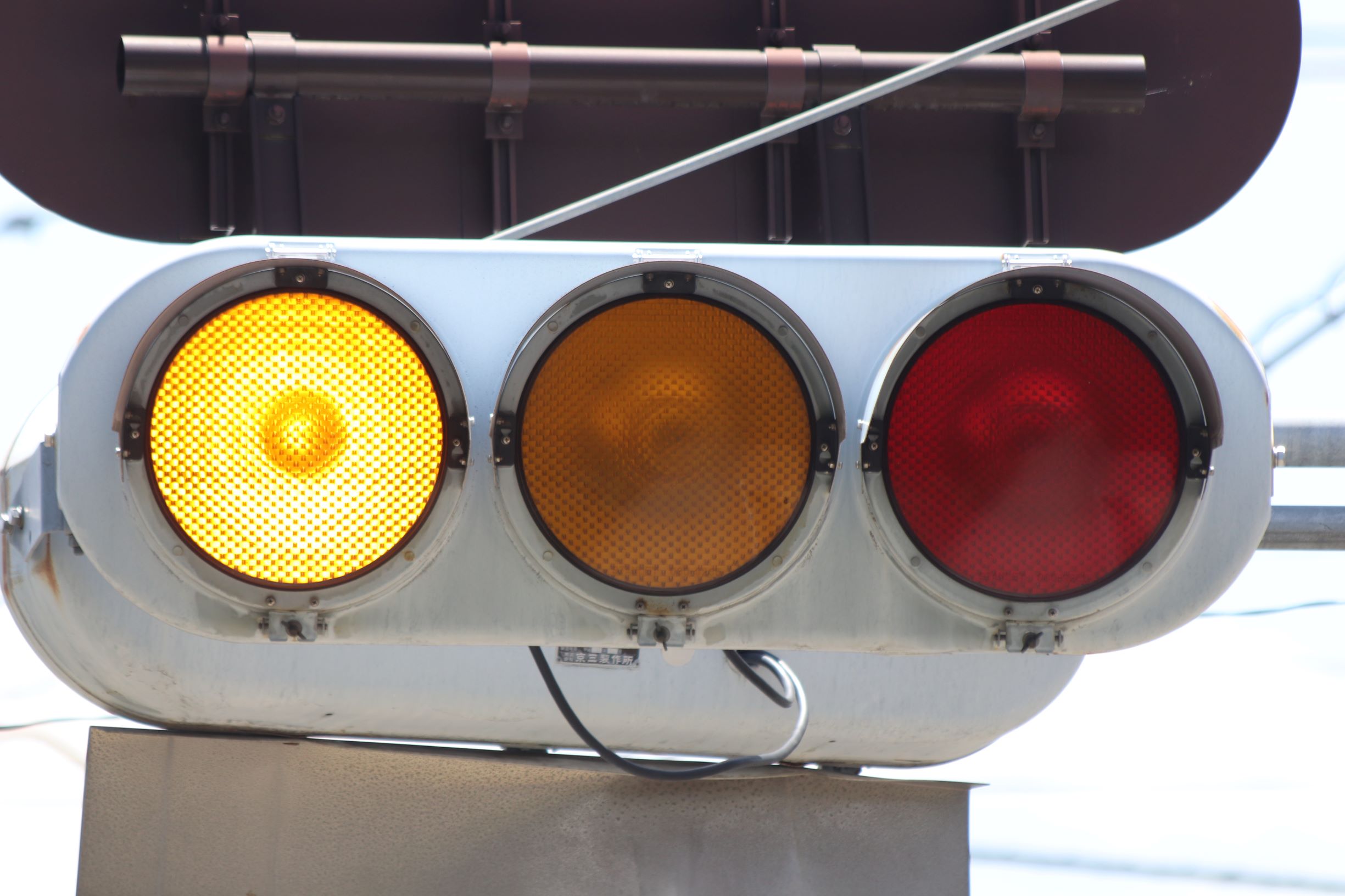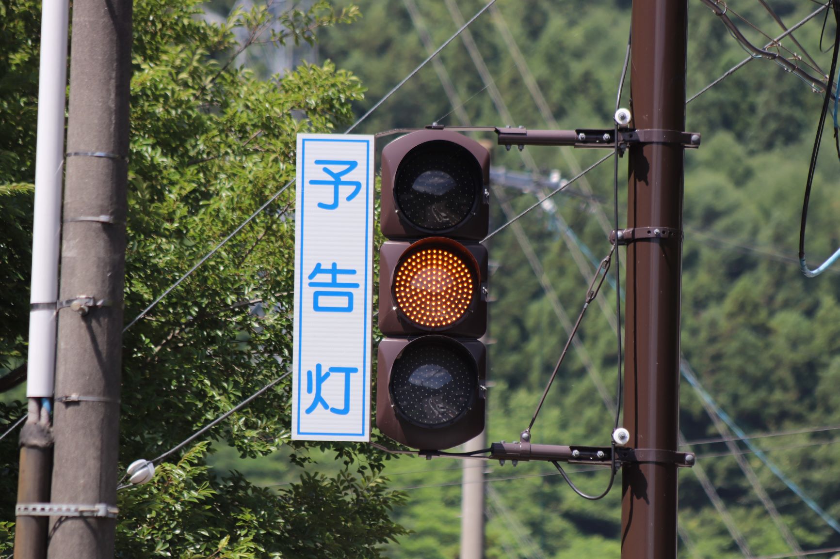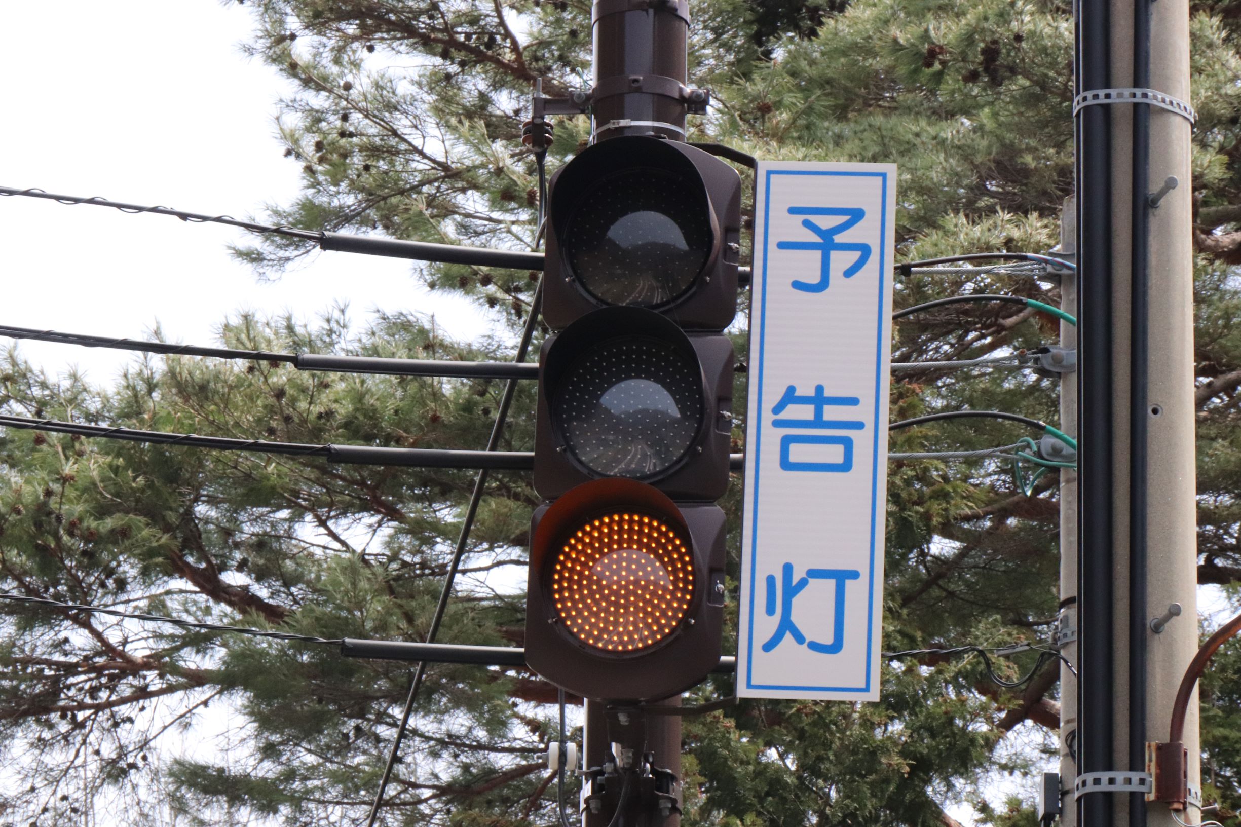長野式のYYR予告灯です。前方の信号機が青の時は下と真ん中の黄色が交互点滅し、黄色の時は真ん中の黄色が点灯し、赤の時は赤が点灯します。