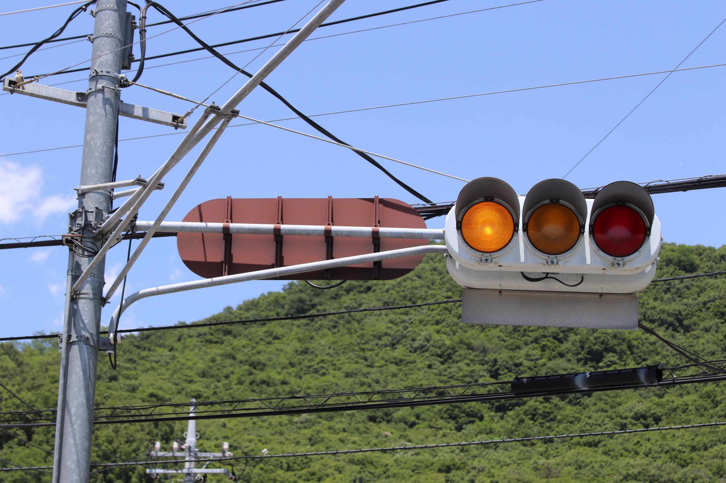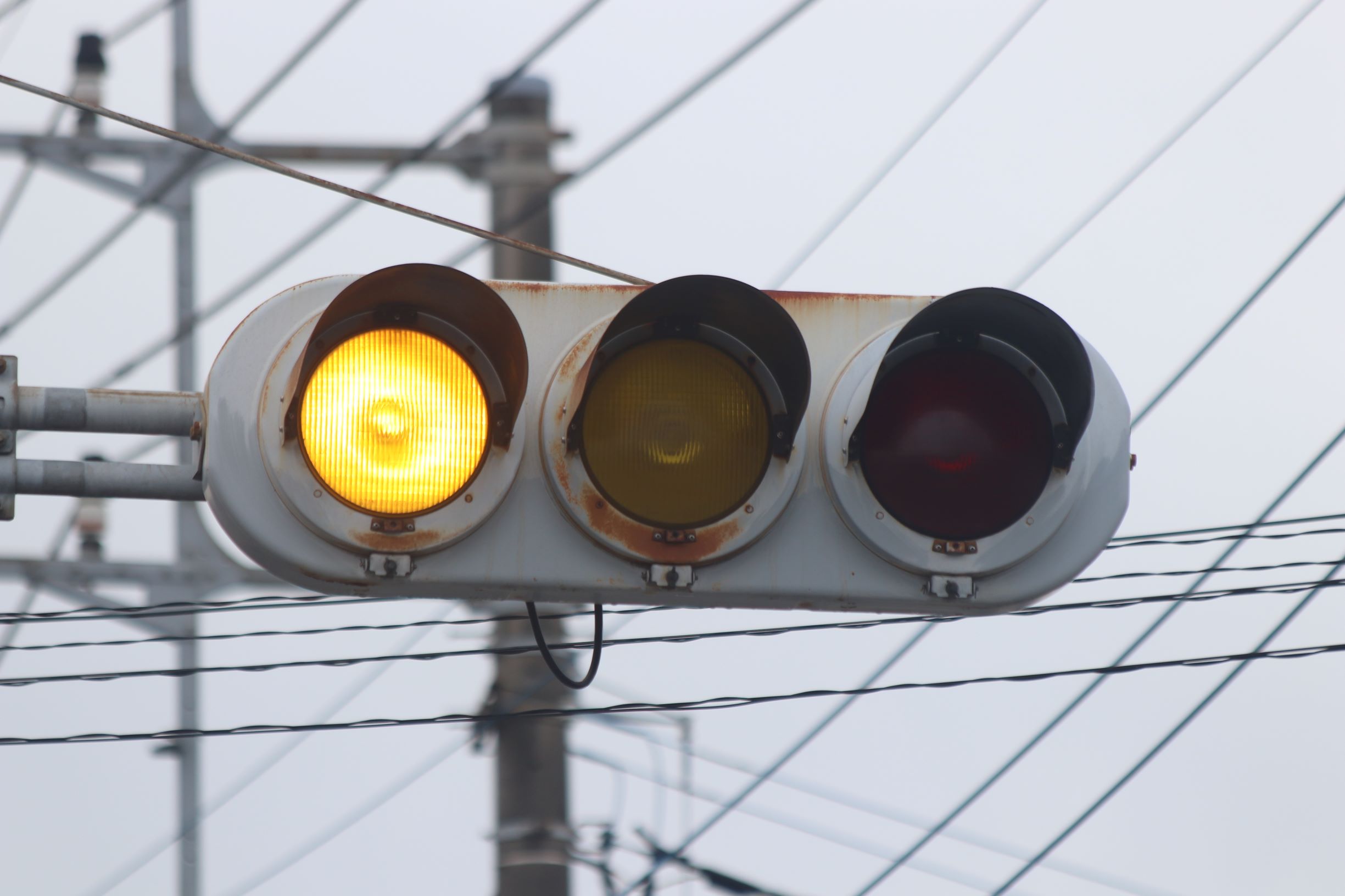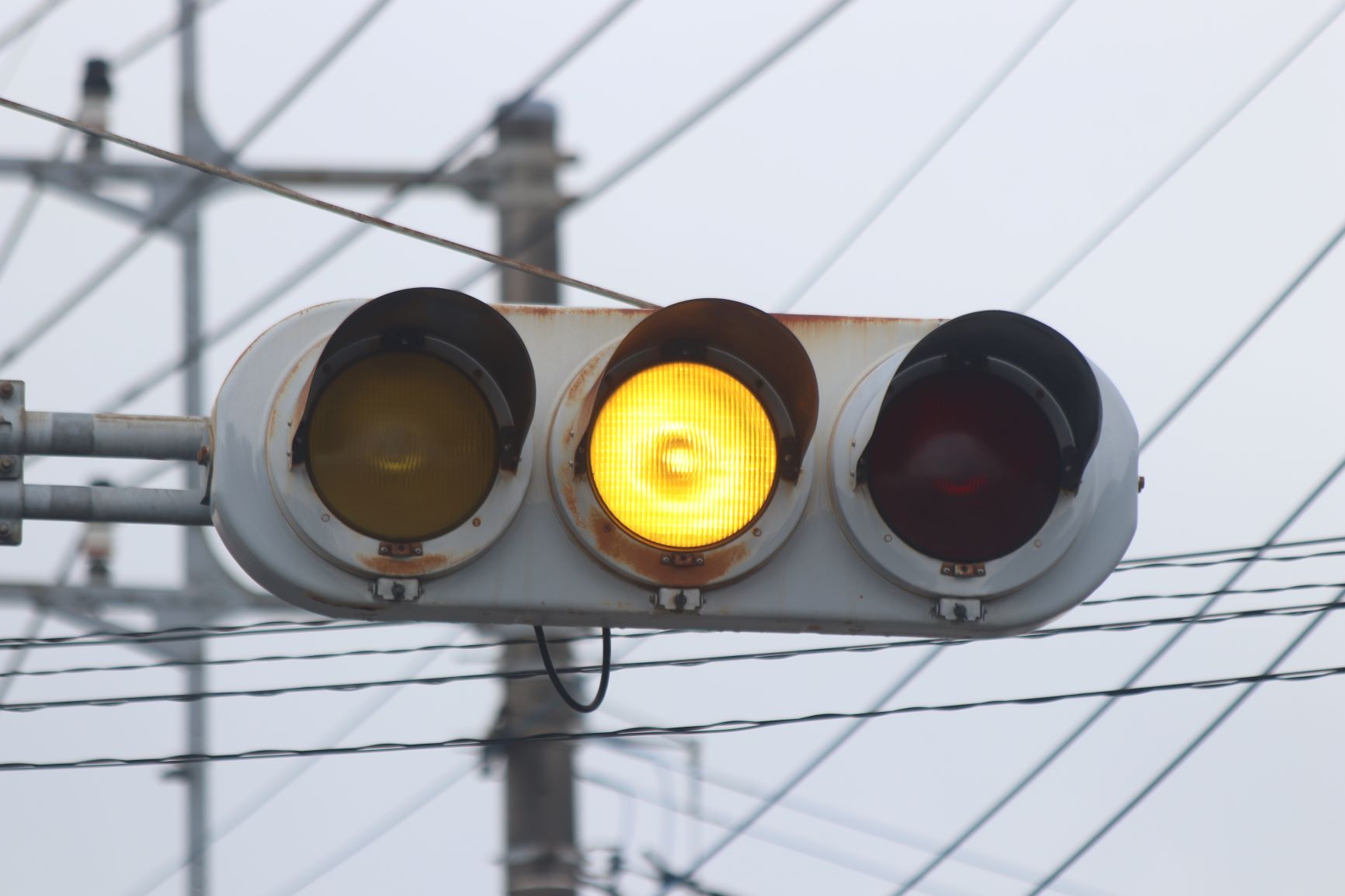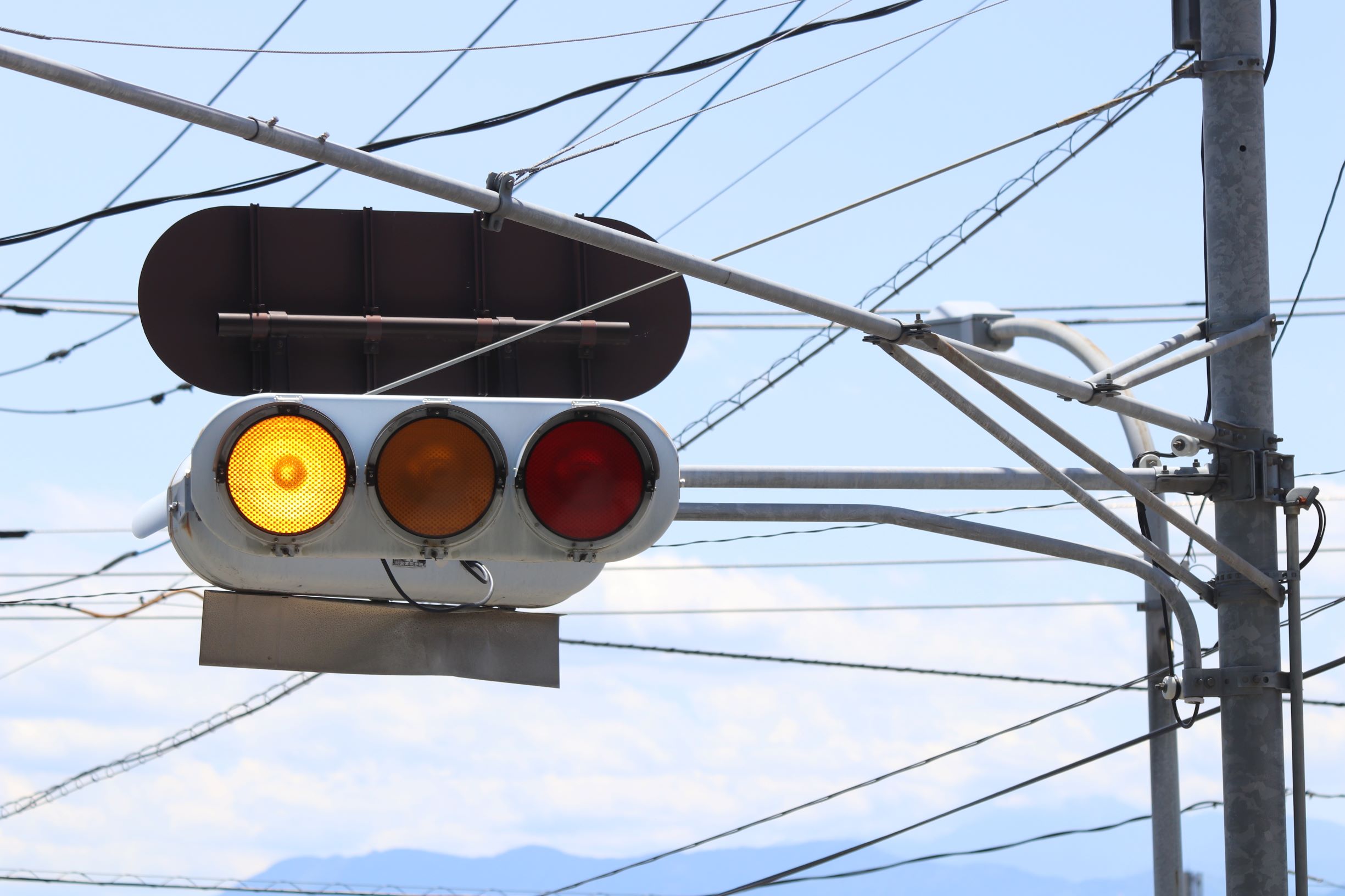 長野式のYYR予告灯です。前方の信号機が青の時は下と真ん中の黄色が交互点滅し、黄色の時は真ん中の黄色が点灯し、赤の時は赤が点灯します。