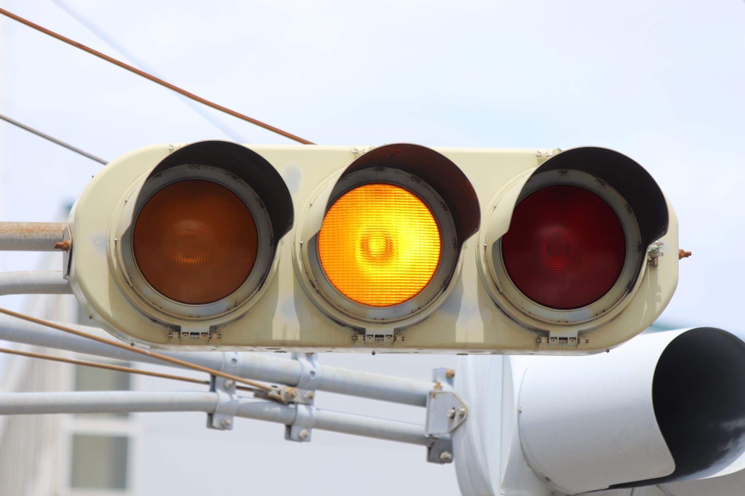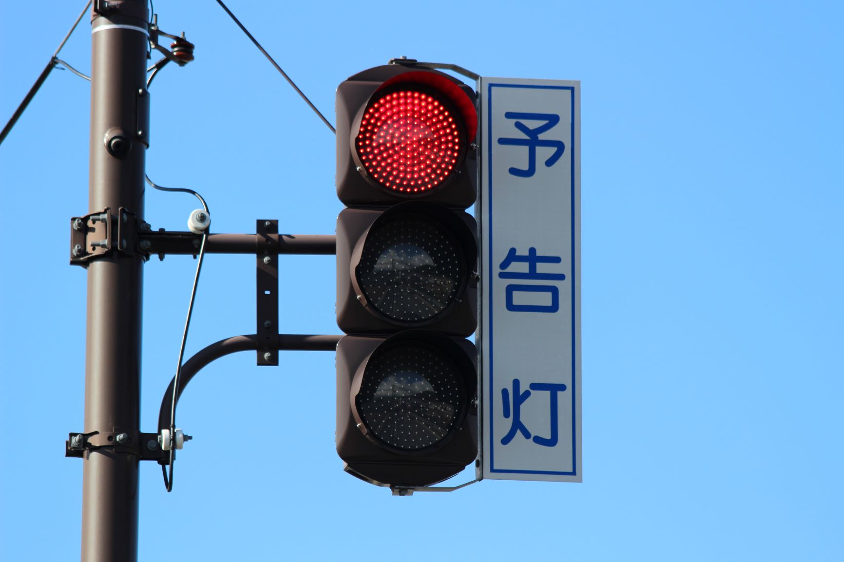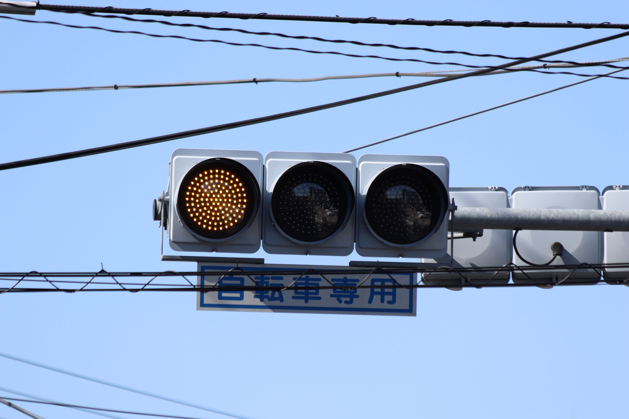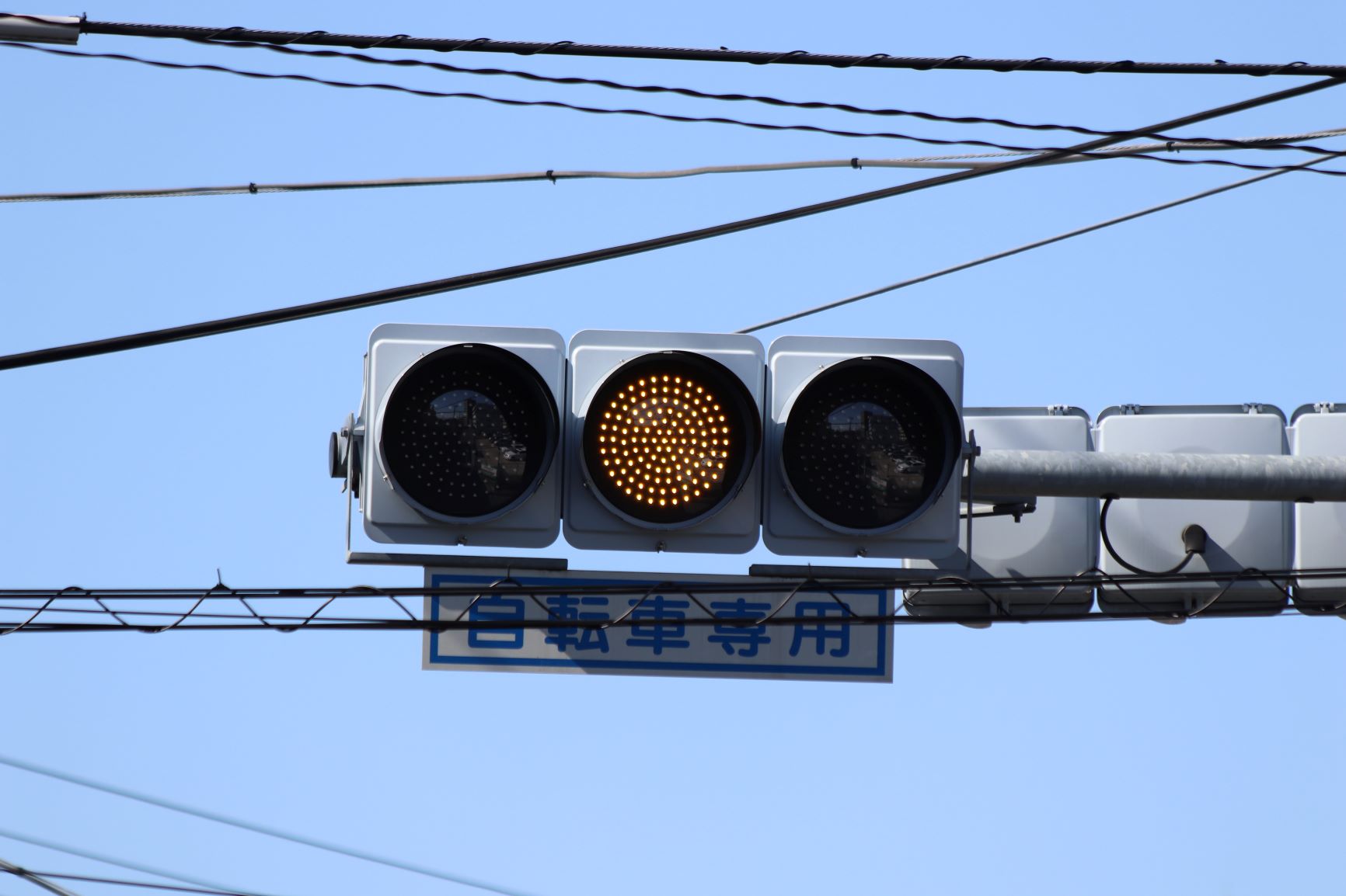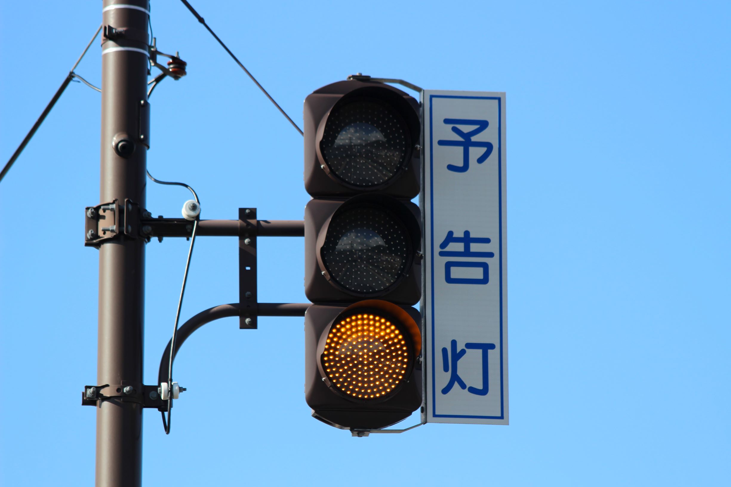 長野式のYYR予告灯です。前方の信号機が青の時は下と真ん中の黄色が交互点滅し、黄色の時は真ん中の黄色が点灯し、赤の時は赤が点灯します。