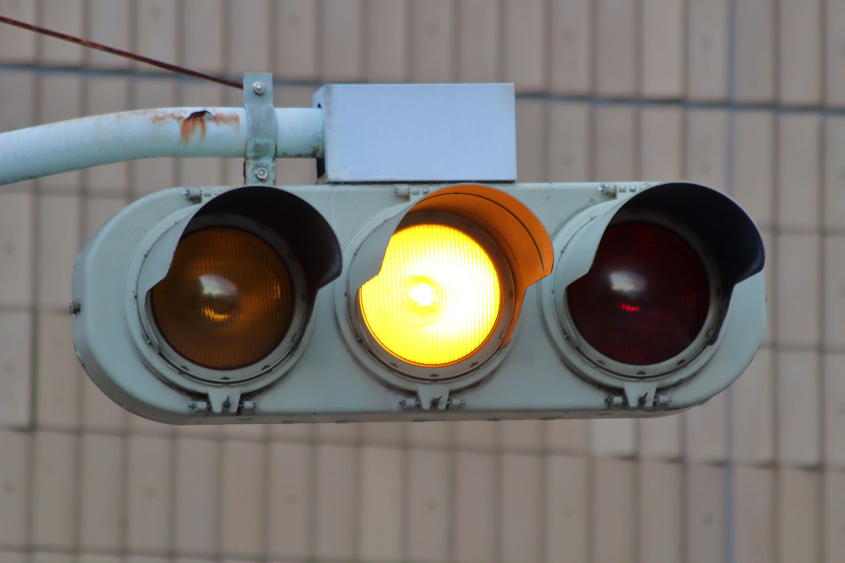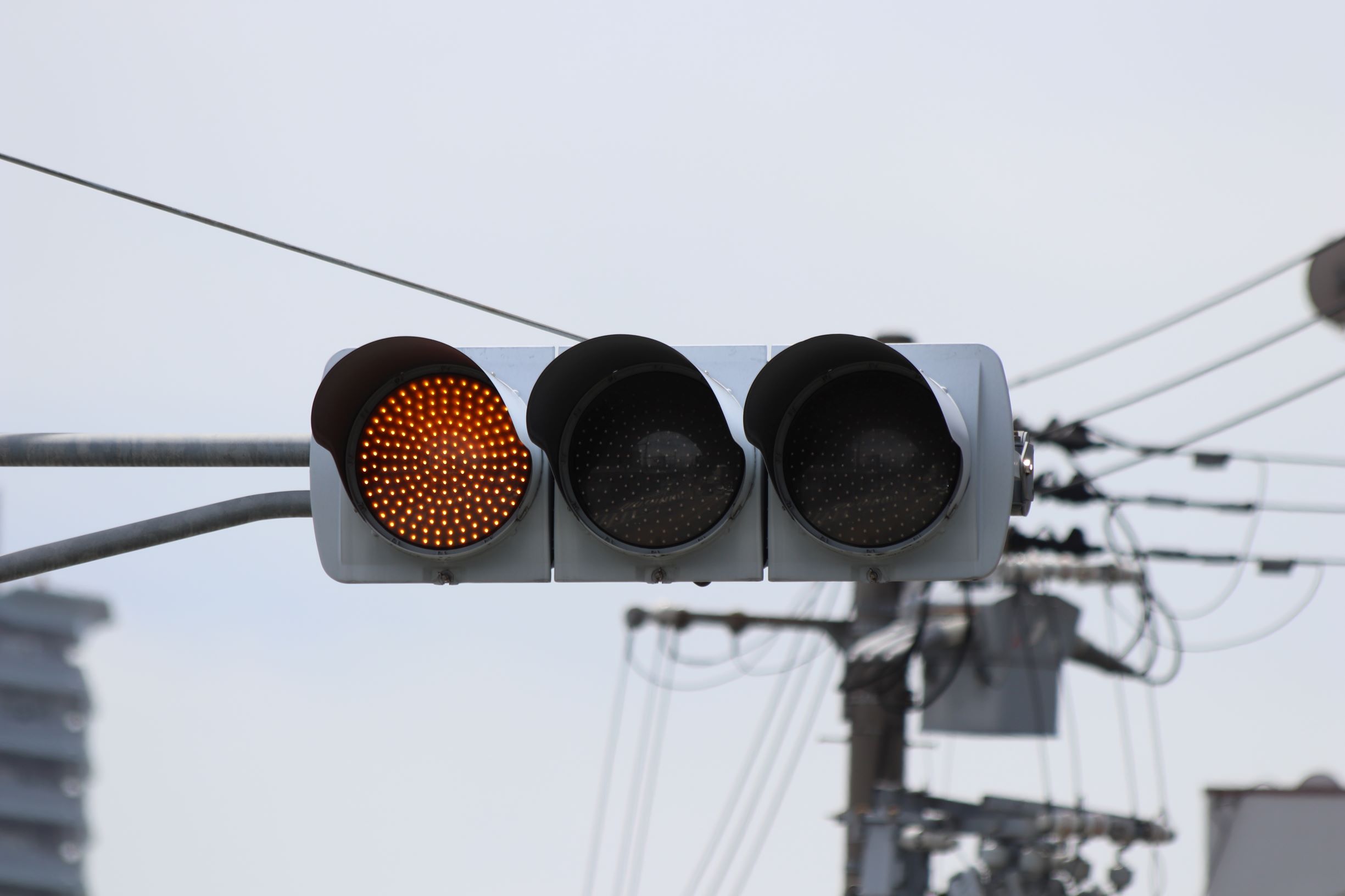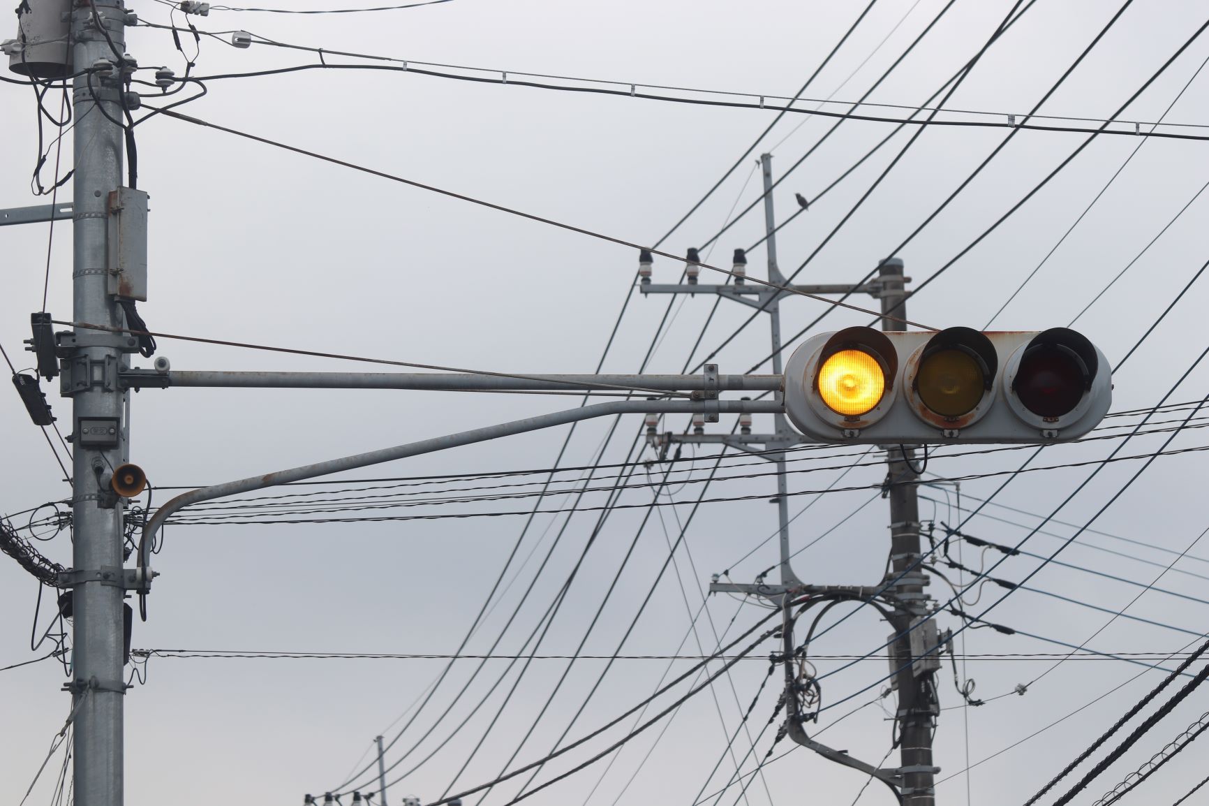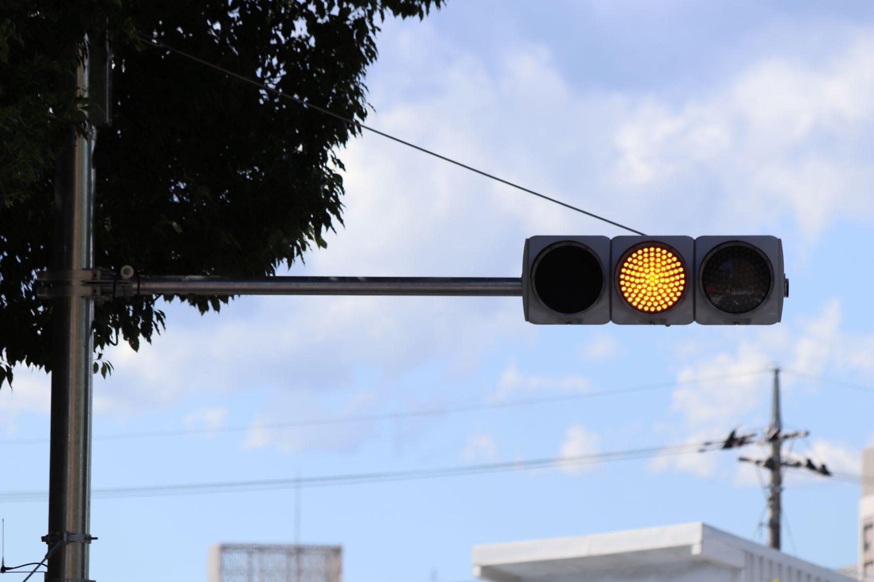 長野式のYYR予告灯です。前方の信号機が青の時は下と真ん中の黄色が交互点滅し、黄色の時は真ん中の黄色が点灯し、赤の時は赤が点灯します。