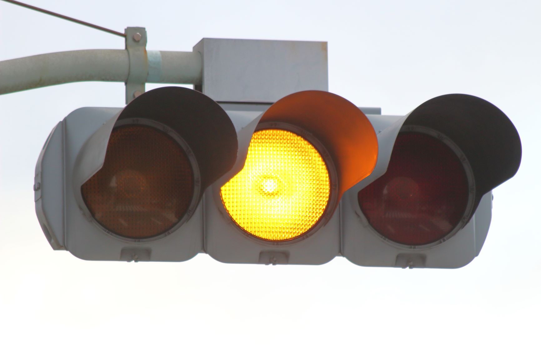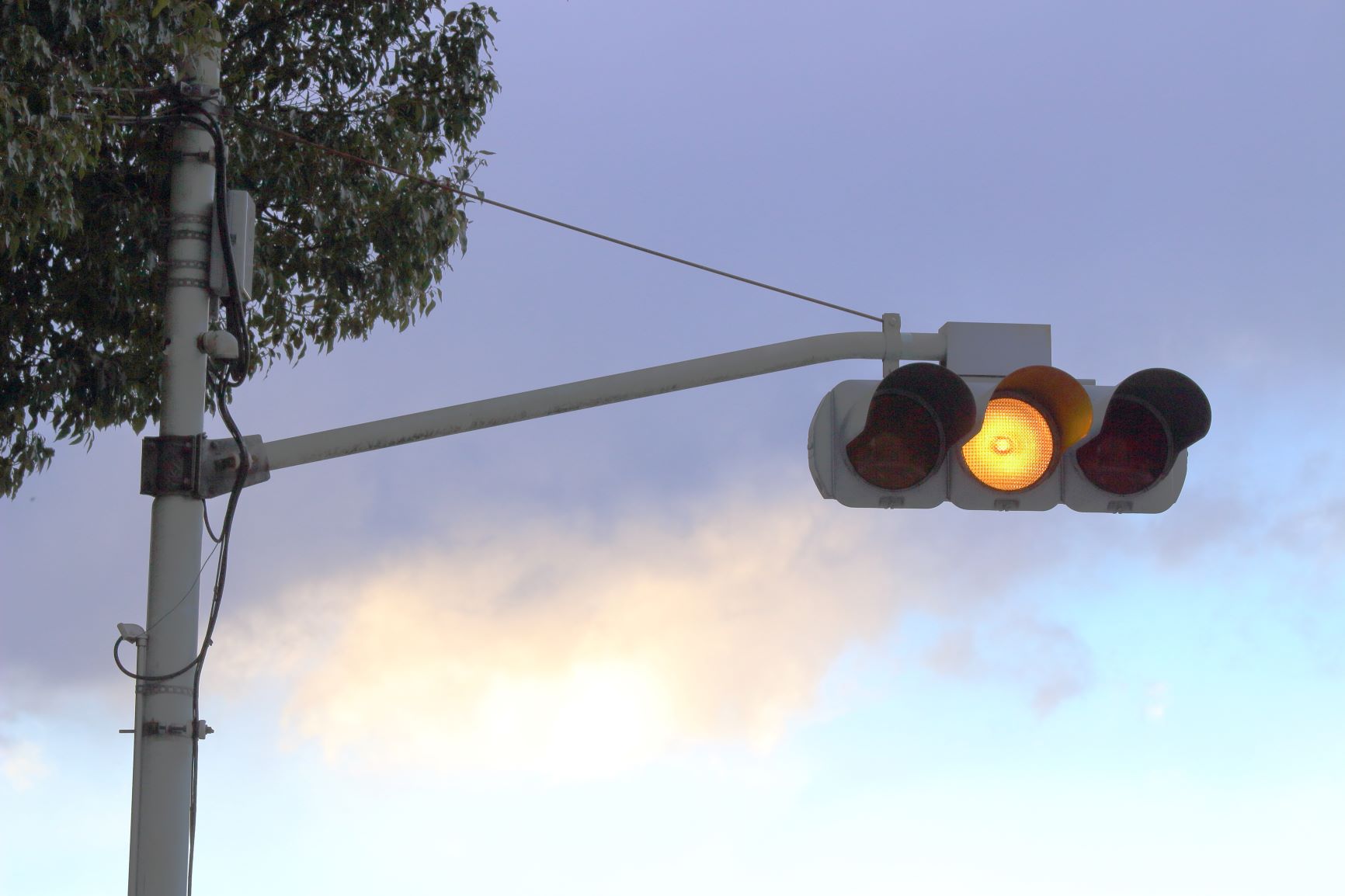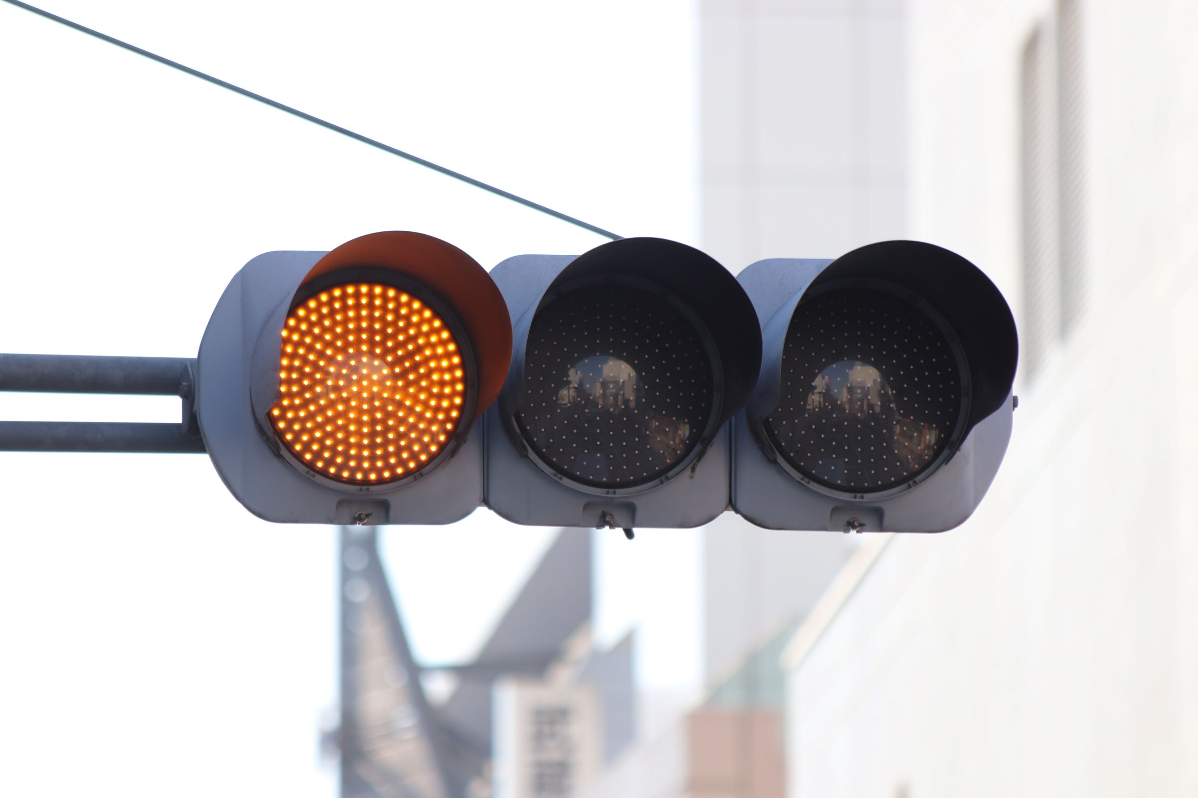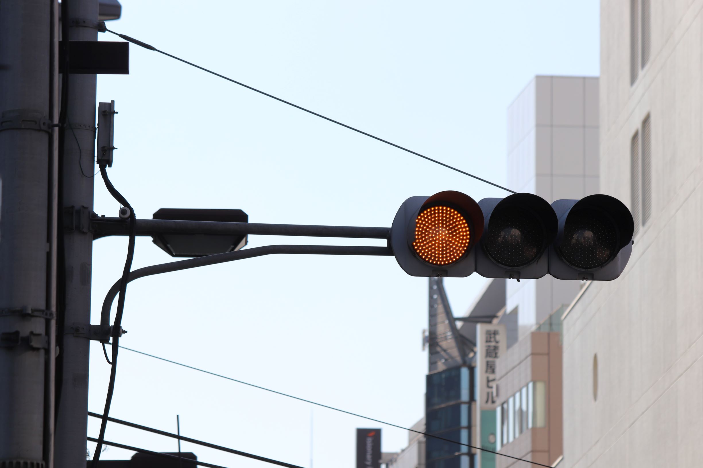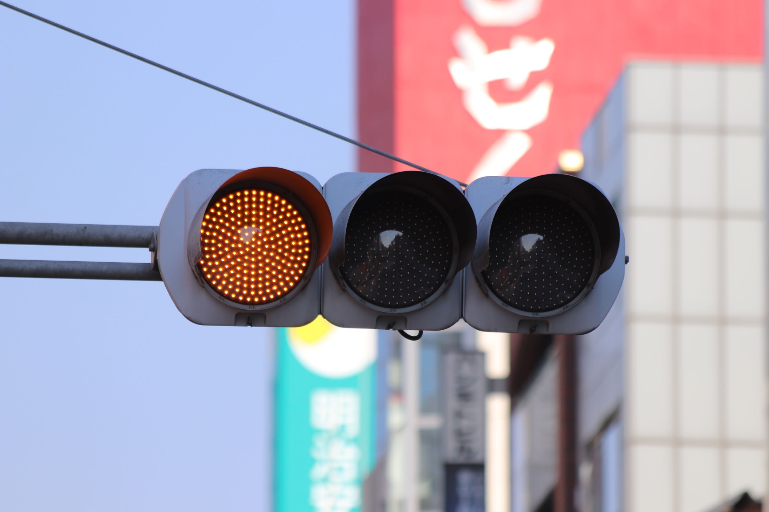 長野式のYYR予告灯です。前方の信号機が青の時は下と真ん中の黄色が交互点滅し、黄色の時は真ん中の黄色が点灯し、赤の時は赤が点灯します。