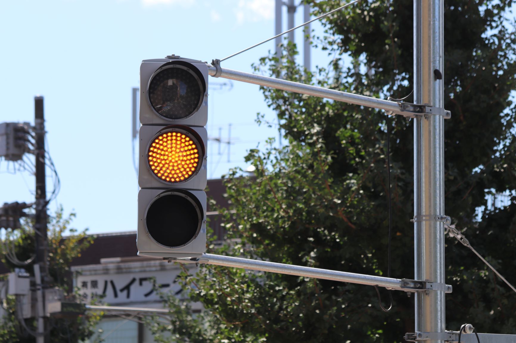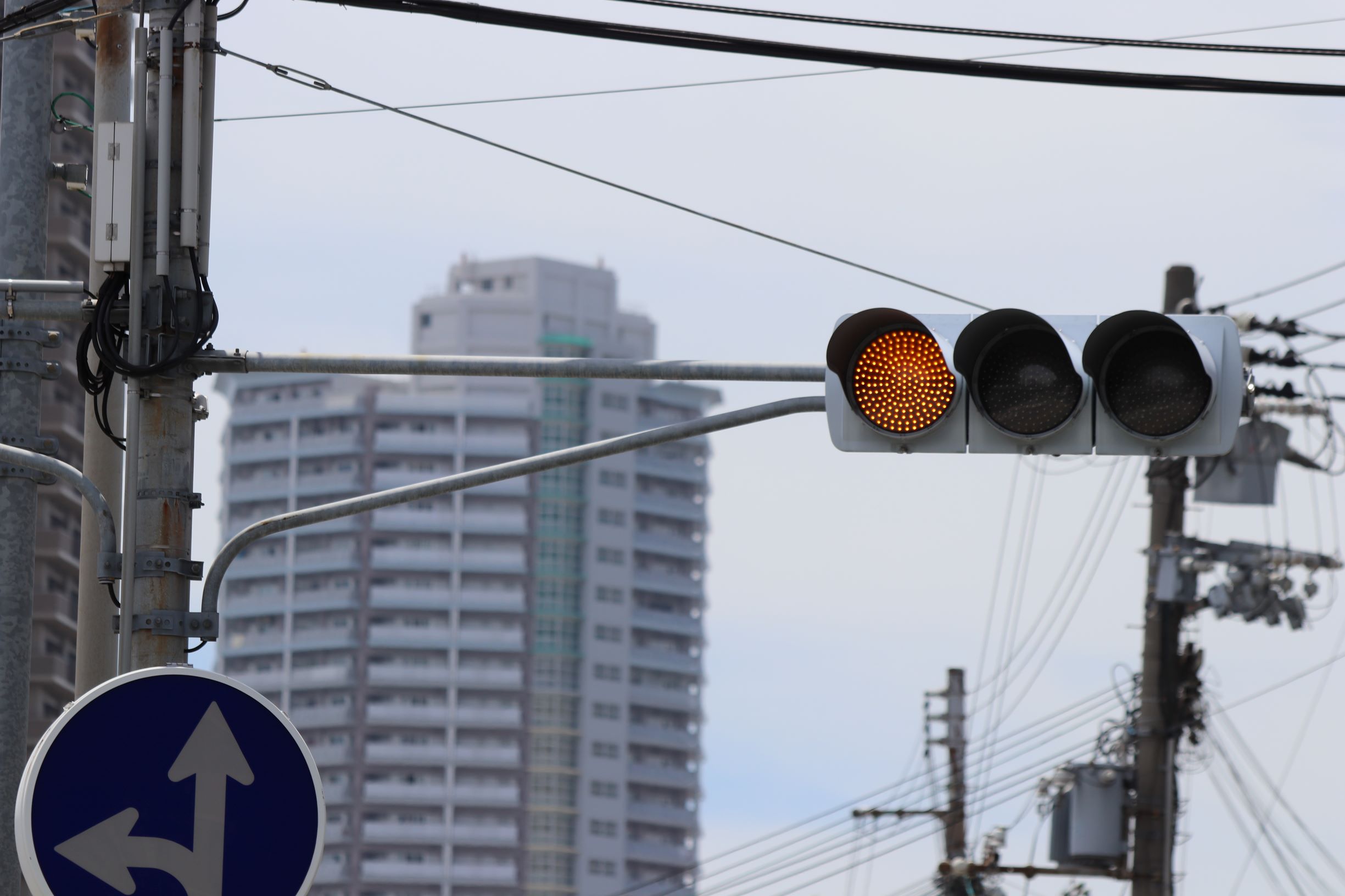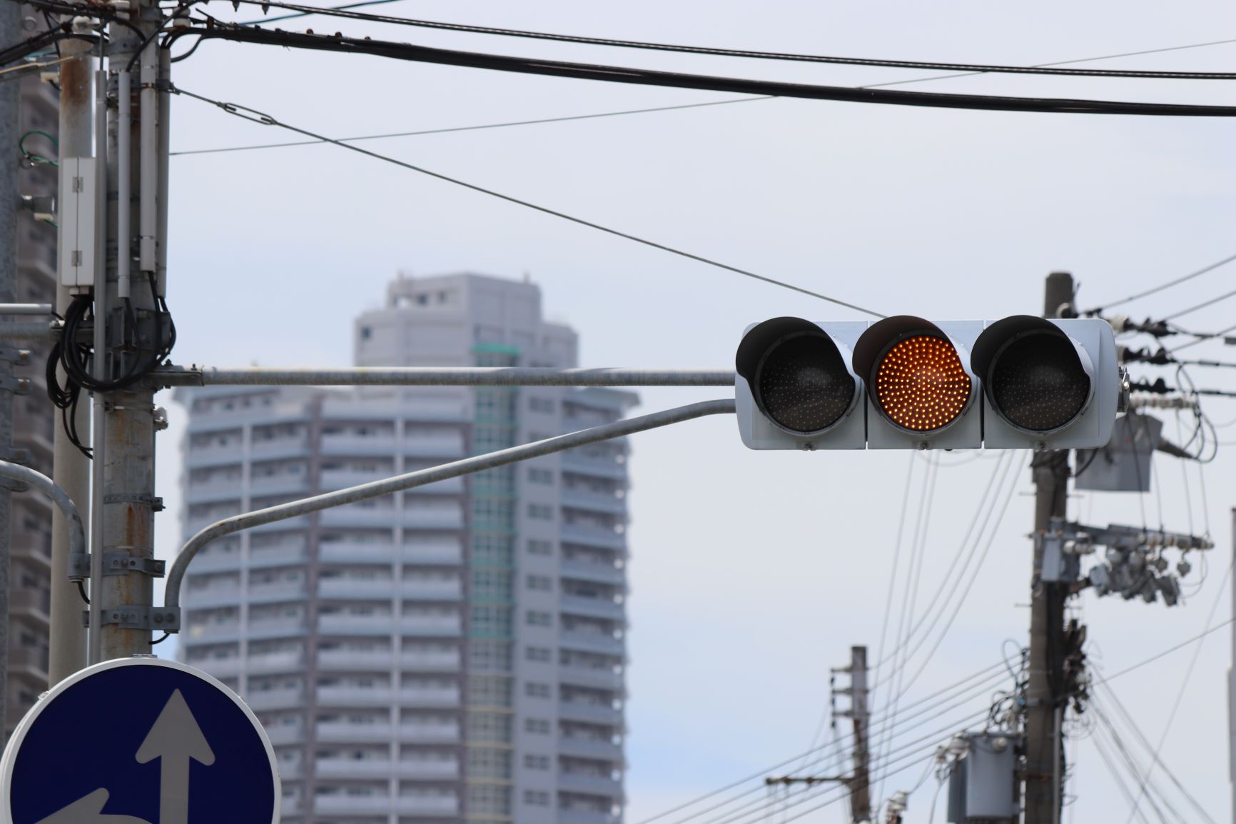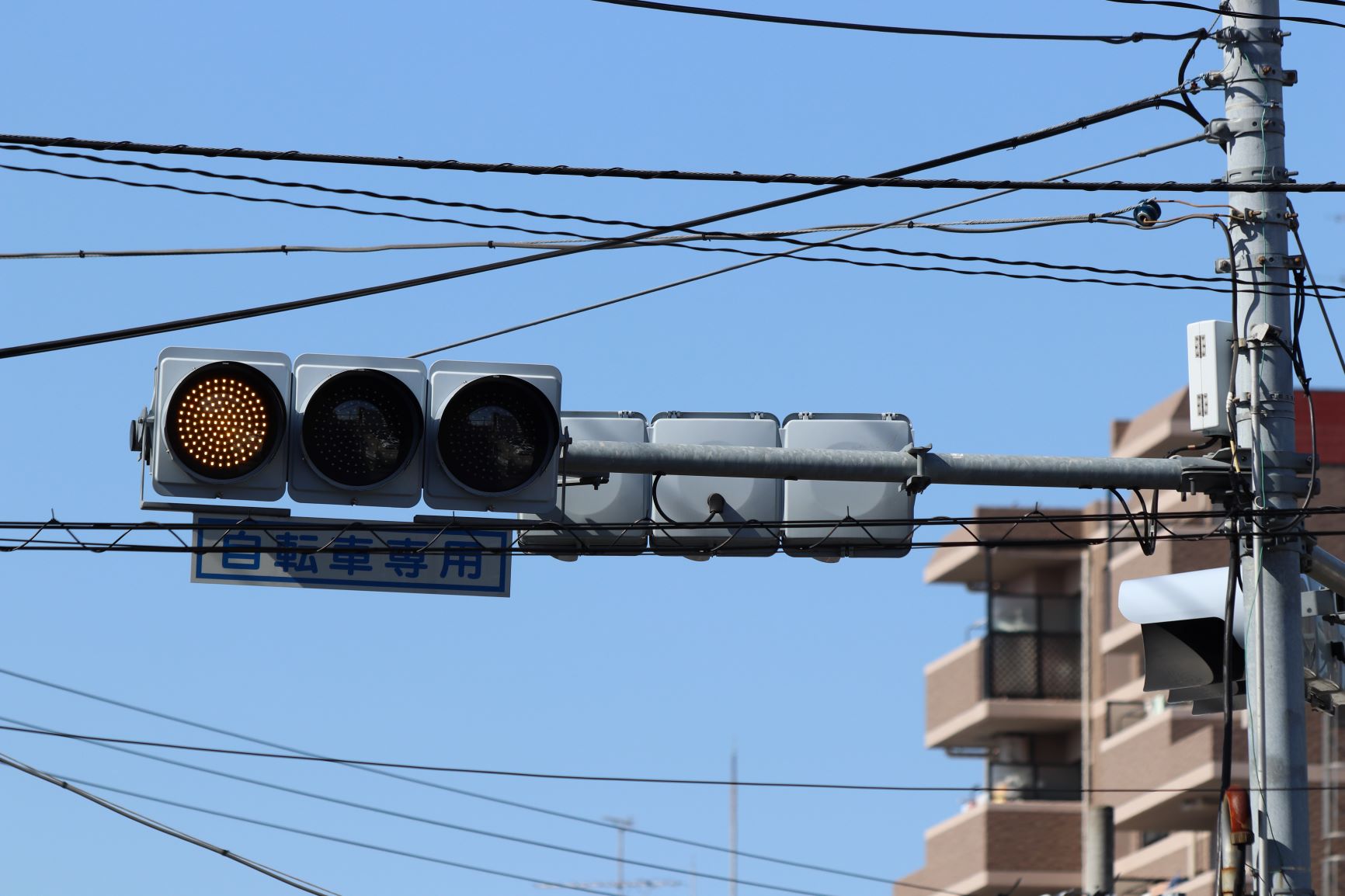 青信号の横断歩道を横切るため、YYR配列の信号機が設置されています。