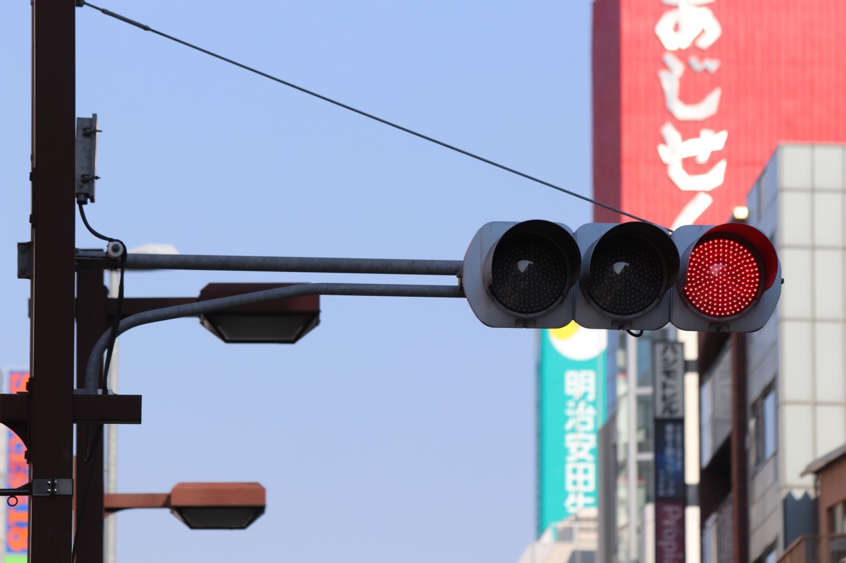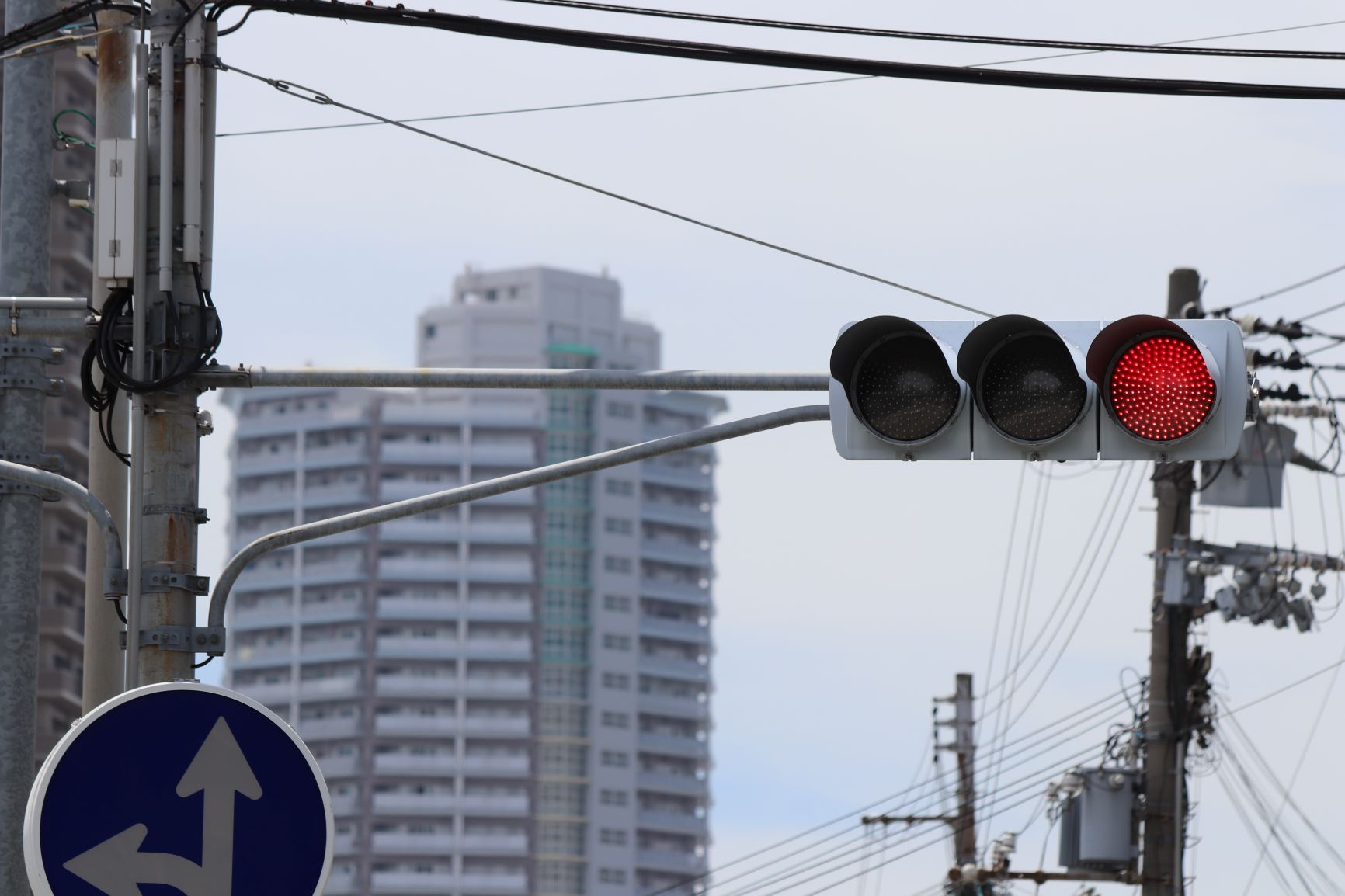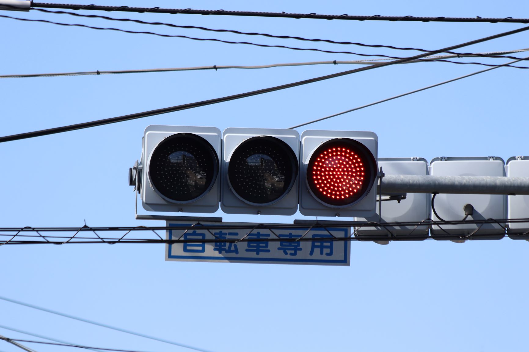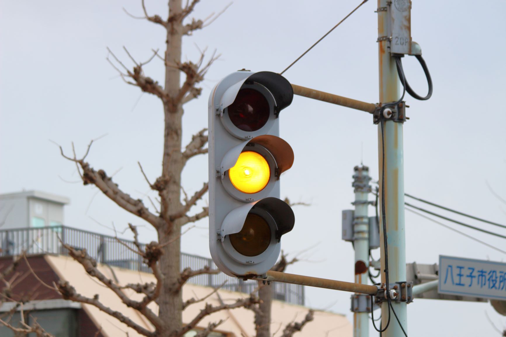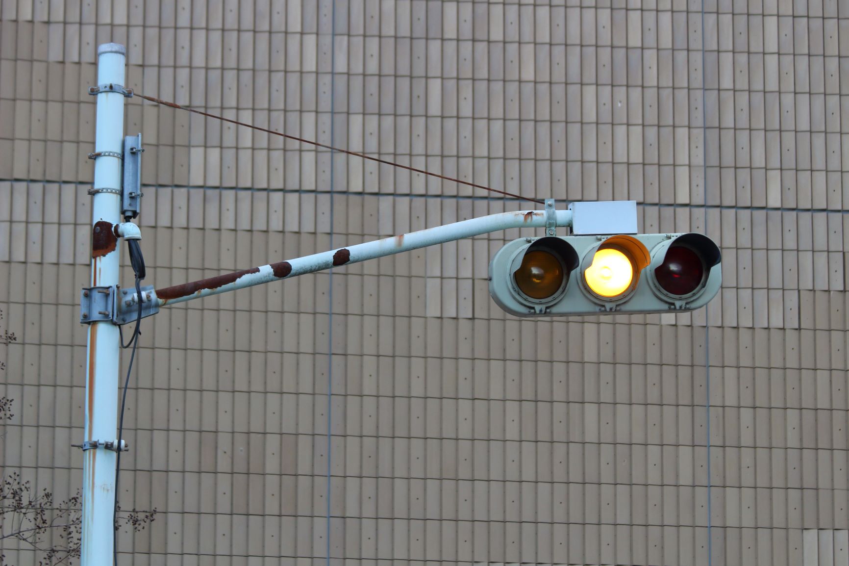 青信号の横断歩道を横切るため、YYR配列の信号機が設置されています。