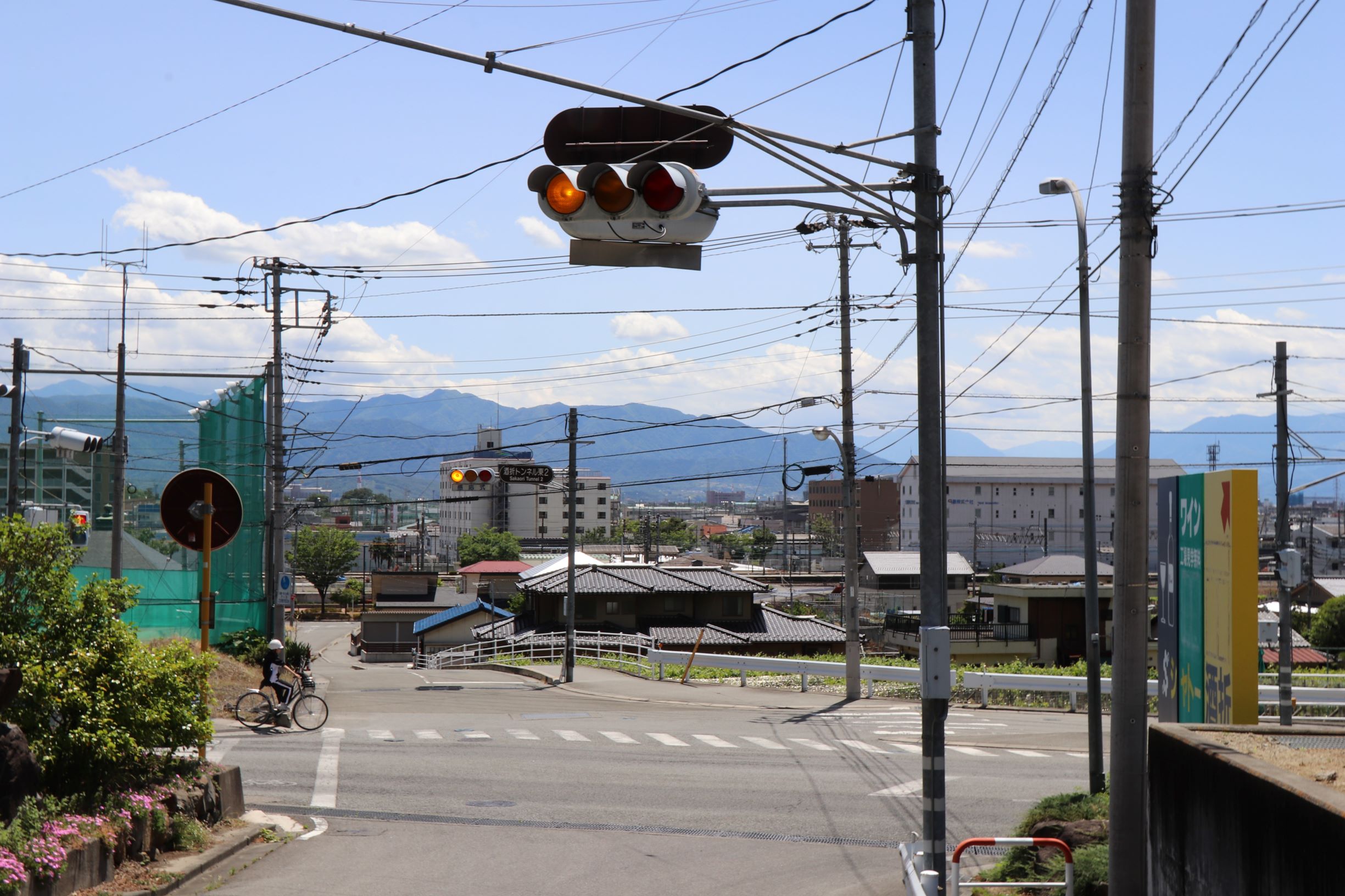 非常に珍しい角型の変則配列です!交差点の近くに踏切があるため、YYR配列の信号機が設置されていました。