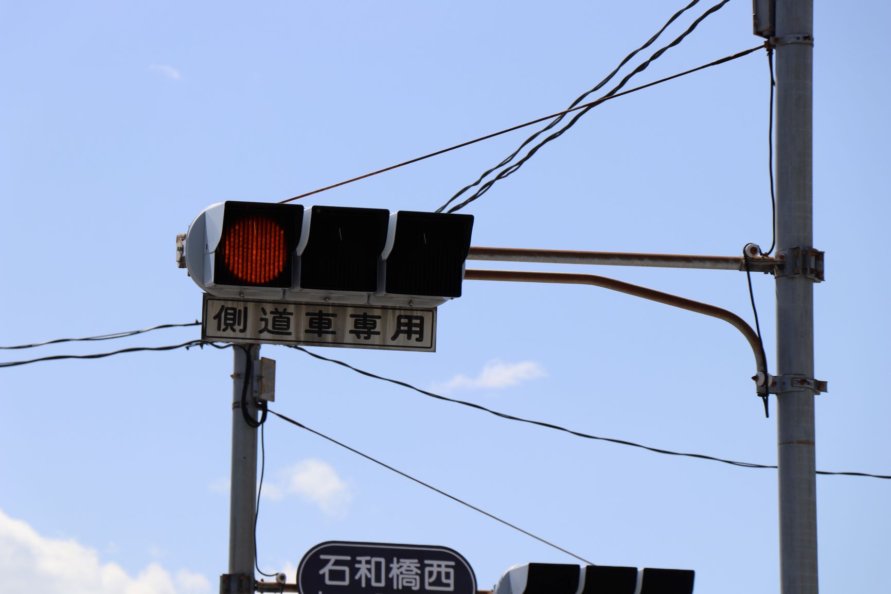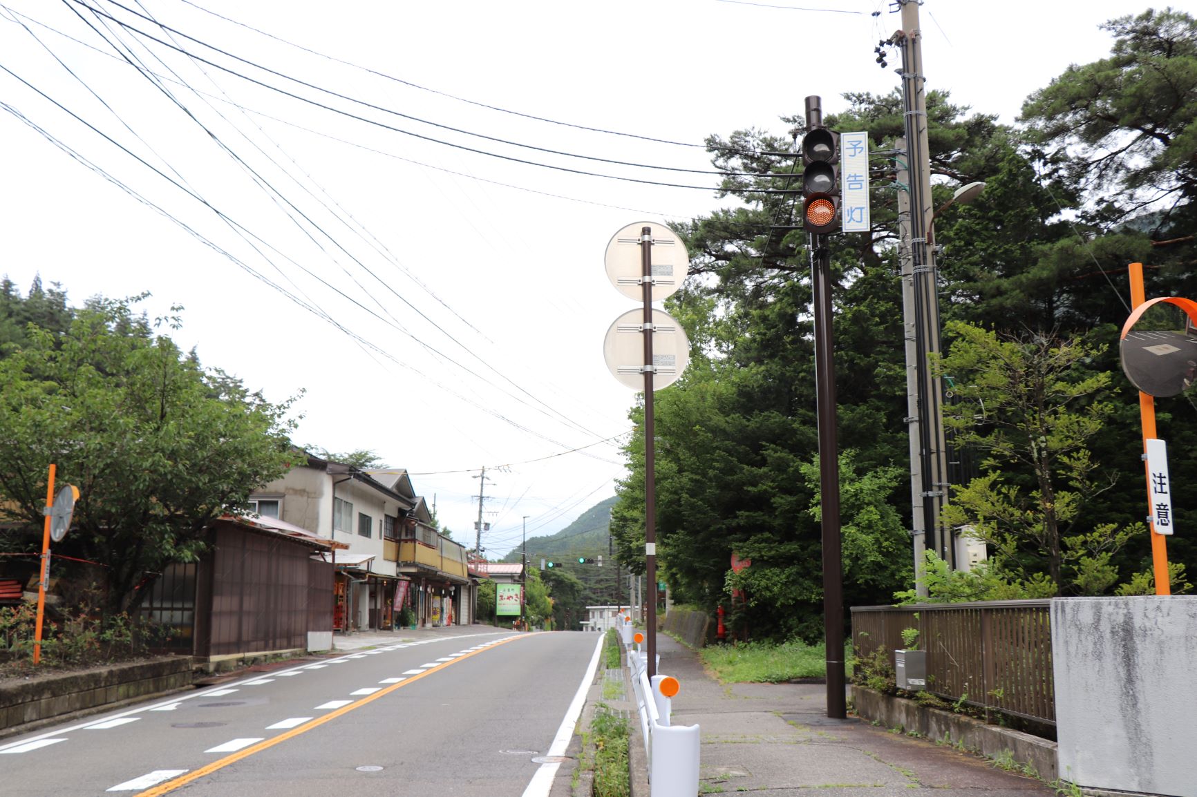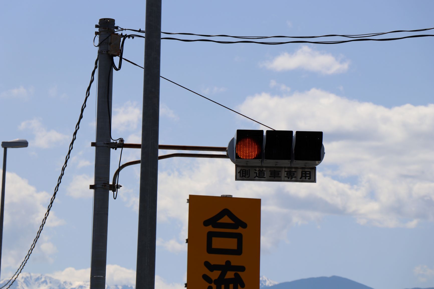 国道との合流地点で、車両に注意を促すためにYYR配列の信号機が設置されています。視角制限庇が取り付けられています。